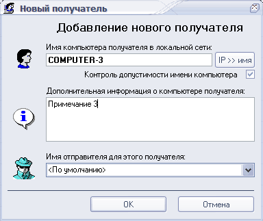 Для добавления нового получателя можно либо выбрать команду контекстного меню "Действия" > "Добавить получателя...", либо воспользоваться "Списком компьютеров в сети". Отобразится форма добавления получателя. Работа с этой формой также чрезвычайно проста. В поле "Имя компьютера получателя..." нужно ввести имя компьютера в Вашей локальной сети, на который Вы хотели бы отправлять сообщения. Если отмечена опция "Контроль допустимости имени компьютера", то на вводимую в поле "Имя компьютера" налагаются следующие ограничения: