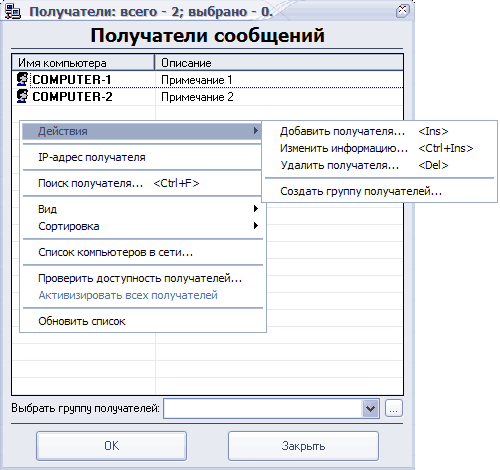 выбранный компьютер в список получателей, изменить информацию (если компьютер