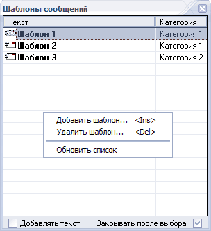 Для того, чтобы использовать сохраненные шаблоны сообщений, необходимо отобразить список шаблонов. Это делается в главной форме программы с помощью кнопки "Шаблоны сообщений ". Каждое нажатие кнопки либо показывает, либо скрывает список шаблонов. Также можно выбрать команду меню "Вид" > "Окно 'Шаблоны'". Затем необходимо сделать двойной щелчок на необходимом шаблоне, текст автоматически добавится в поле "Текст сообщения", а список шаблонов закроется. Чтобы при выборе шаблона список не закрывался, необходимо снять отметку с опции "Закрывать после выбора" в нижней части списка шаблонов. Также, если Вы хотите, чтобы текст выбранного шаблона не заменял текущий текст сообщения, а добавлялся в конец текста, отметьте опцию "Добавлять текст" в нижней части списка шаблонов.