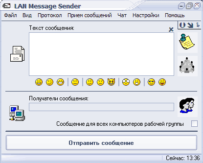 Немного ниже поля ввода текста сообщения находится панель смайлов. Вы можете использовать ее для быстрого добавления смайлов в Ваши сообщения. В поле ввода текста сообщения смайлы добавляются, как текстовые символы, если получатель использует программу LAN Message Sender для получения сообщений, то в окне чата у получателя отобразятся графические смайлы. Также для быстрой вставки смайлов можно использовать функциональные клавиши F2-F12. Клавиши используются в том же порядке, в котором смайлы отображаются на панели смайлов.