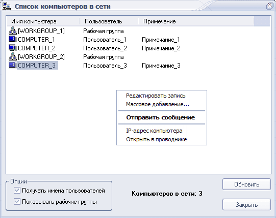 Кроме списка получателей в программе существует список всех компьютеров, находящихся в сети. С помощью него можно быстро отправить сообщение на любой компьютер сети (даже без добавления его в список получателей), а также быстро и безошибочно заполнить список получателей. Для отображения этого списка необходимо выбрать команду контекстного меню "Список компьютеров в сети...". Будет сформирован список компьютеров с информацией об имени компьютера, имени текущего пользователя компьютера, добавлен ли компьютер в список получателей и примечании из списка получателей.