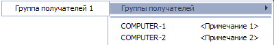 Существует возможность объединения получателей в единые группы, что позволит в последствии быстро выбирать несколько получателей. Под списком получателей находится список групп получателей. Рядом с ним находится кнопка работы с группами ("..."), при нажатии на которую выводится меню, позволяющее добавлять, редактировать, переименовывать и удалять группы получателей.